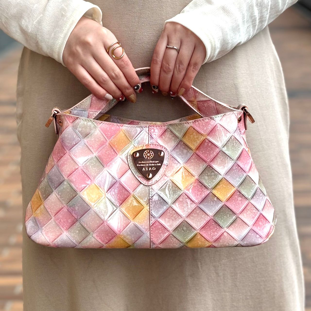 AR:「カラフルなバッグは可愛いけれど手持ちのお洋服との相性が心配という方…大丈夫です!血色カラーのピンクがメインの配色なので肌なじみが良くて実はとっても合わせやすいです!」