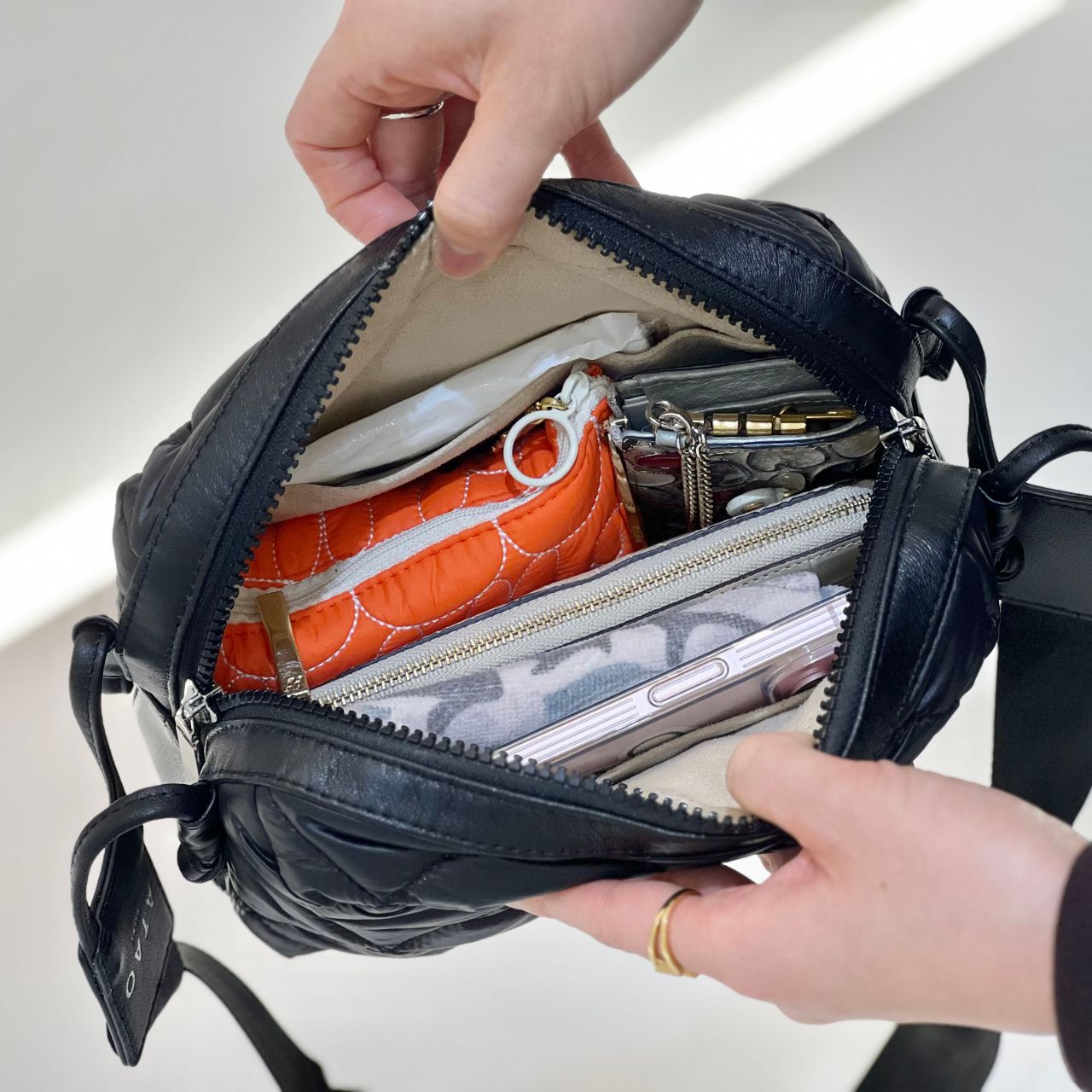 AA:「アメリは特に通勤シーンで重宝しています。すぐに取り出したい貴重品をアメリに入れて、その他のアイテムは大きなバッグに入れておくと電車の混雑時も快適に過ごすことができます。」