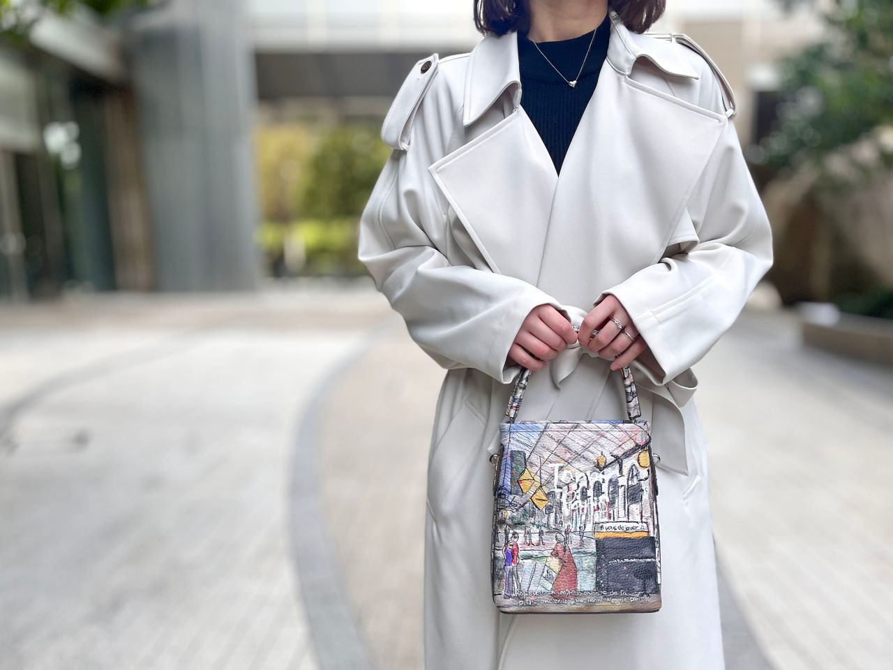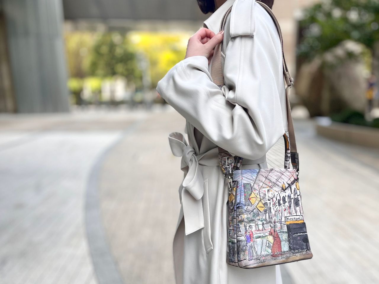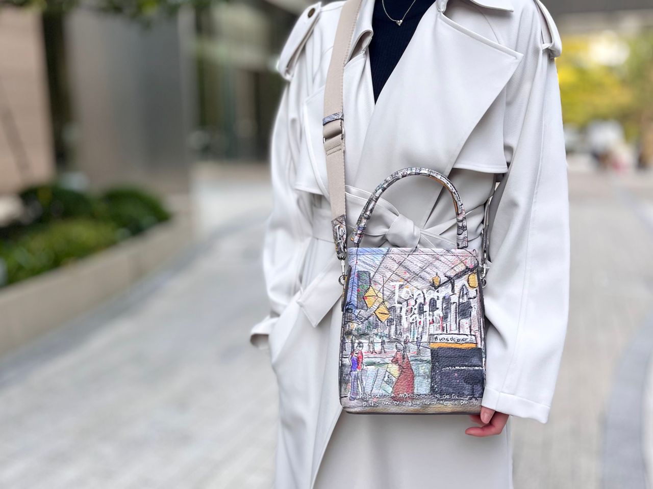 こちらも2025AWで登場したばかりのポシェット〈シャトン〉。「サンラザールのピアノ」は華やかで目を惹く新テキスタイル。輝くイルミネーションにも負けない存在感を放ってくれます。絵画がプリントされたgraffitiシリーズは、華やかではありながら派手すぎることはなく、意外にも普段のコーディネートに合わせやすいんです。