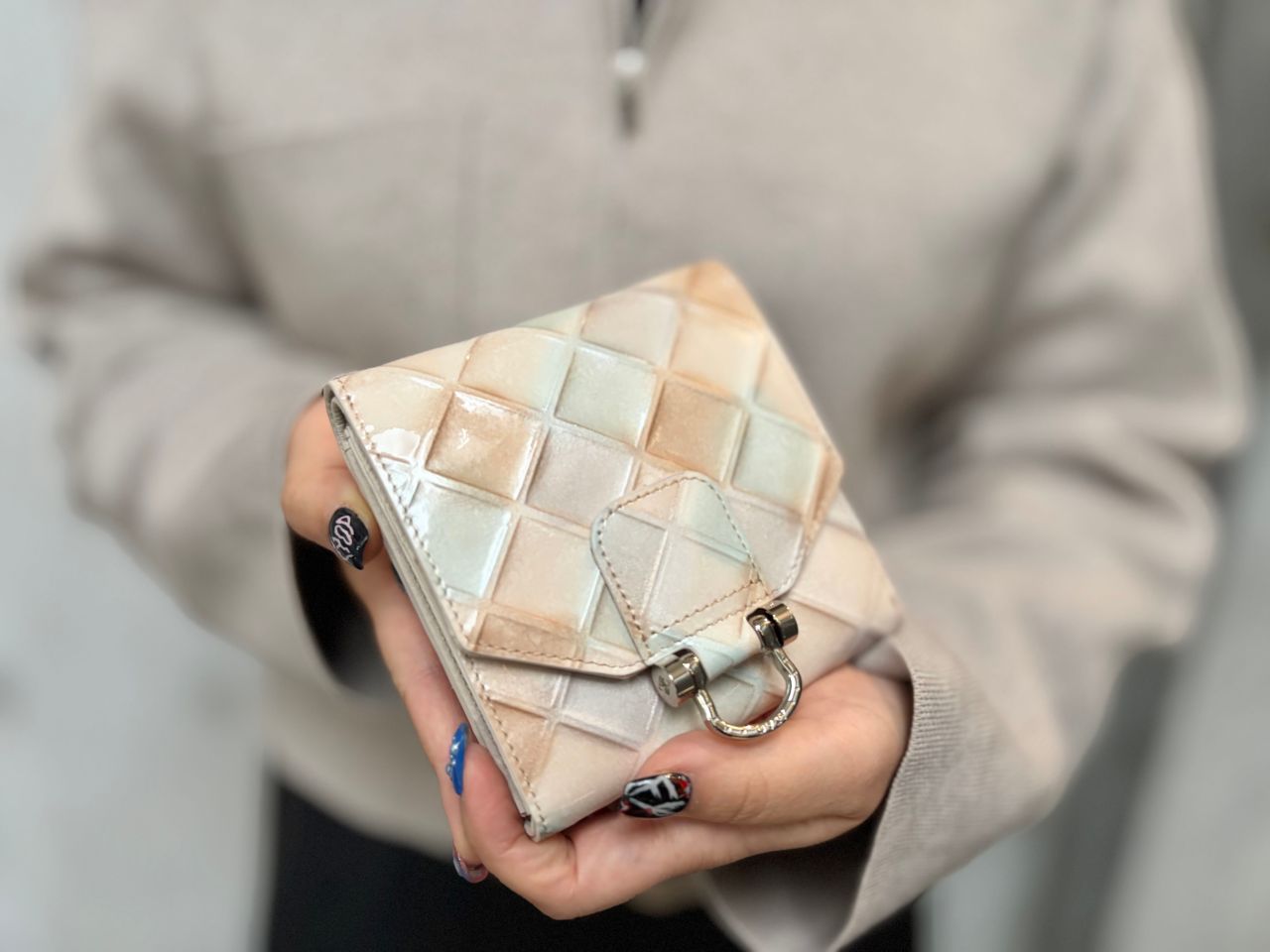 シルバー金具も相まって雪景色に浮かぶほのかなブルー系の仕上がりはとても繊細な印象…。はじける「シャングリラピンク」とはまた違った雰囲気でオシャレですよね!