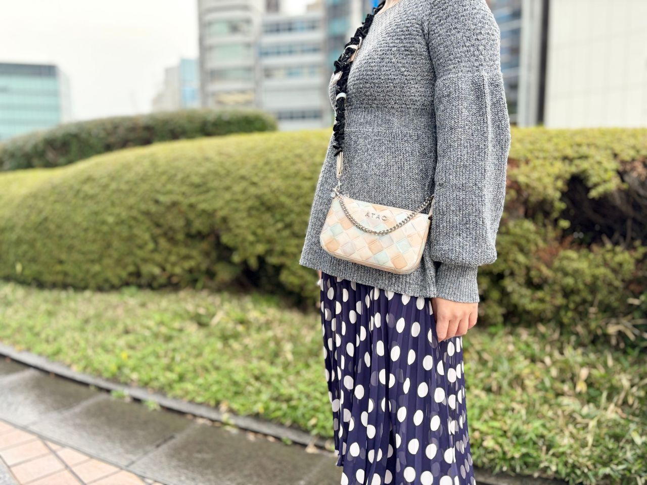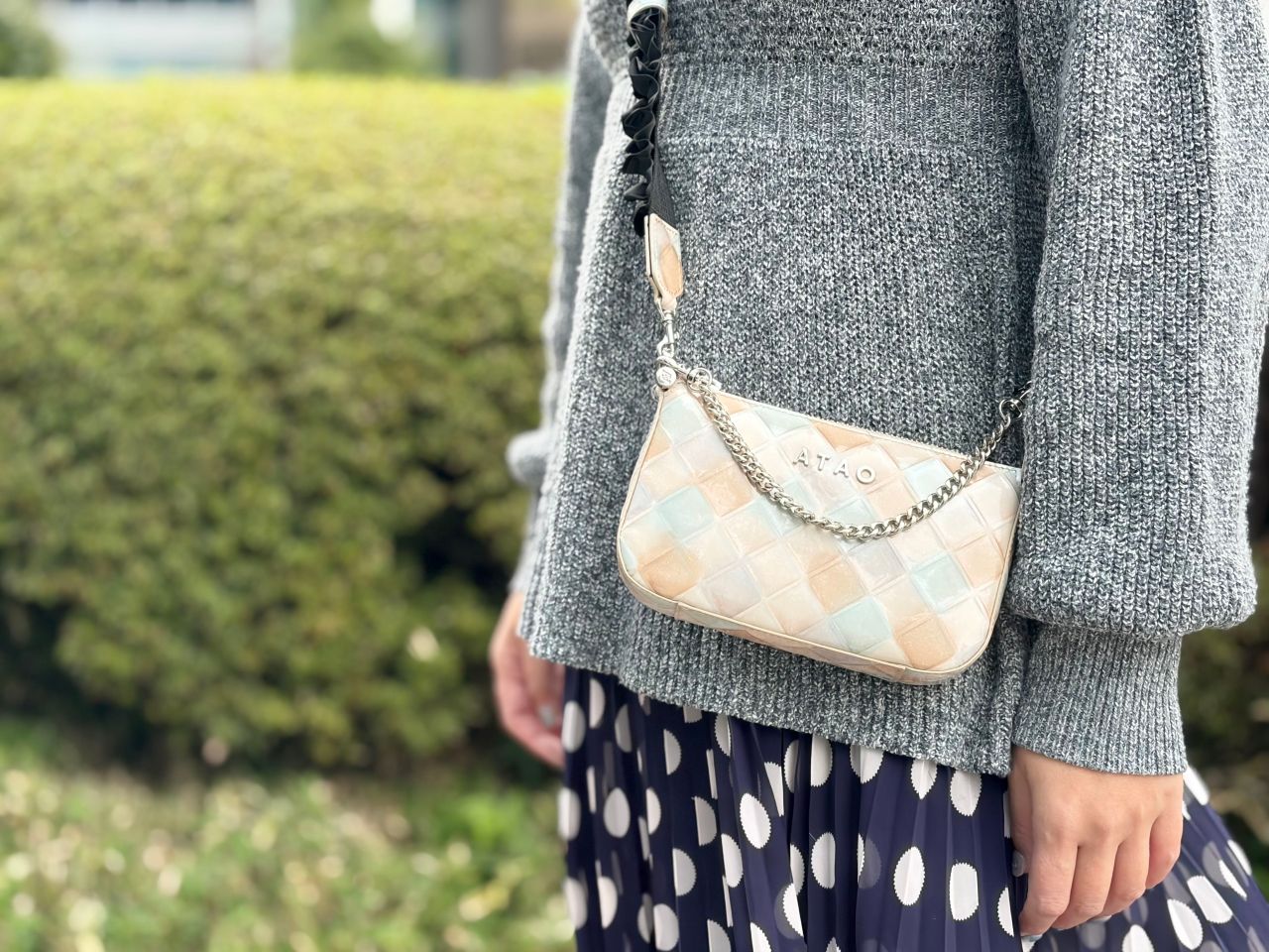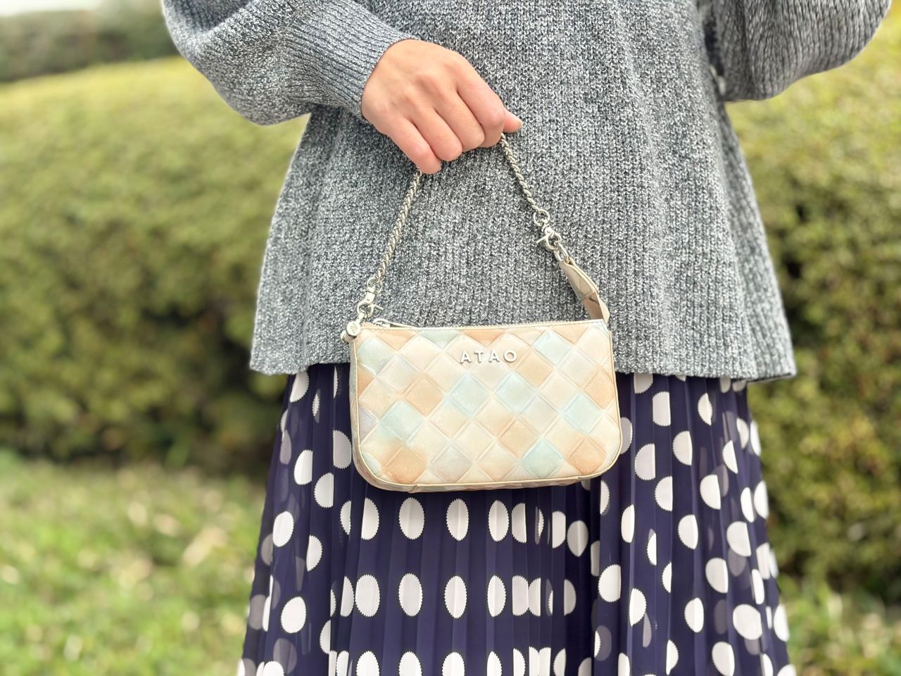 ミニバッグなのでななめ掛けはもちろんですが、シルバーのチェーンがついているので手持ちでフェミニンに持つこともできます♪