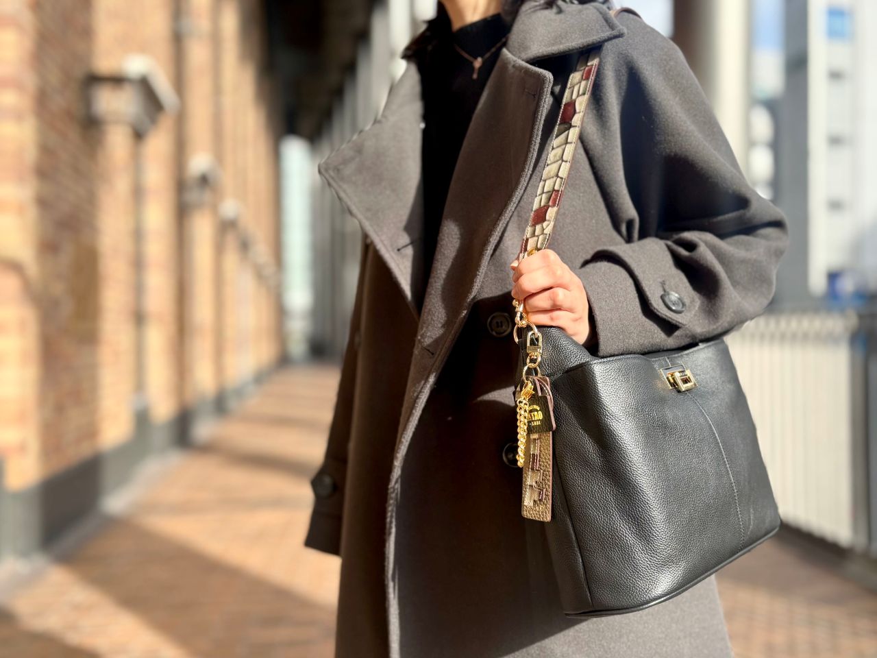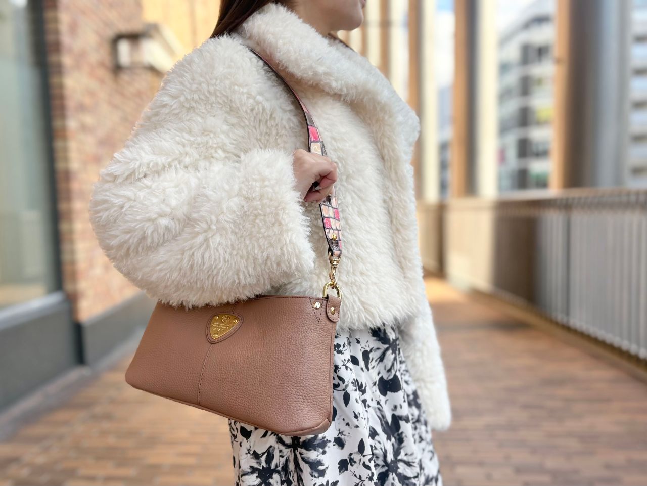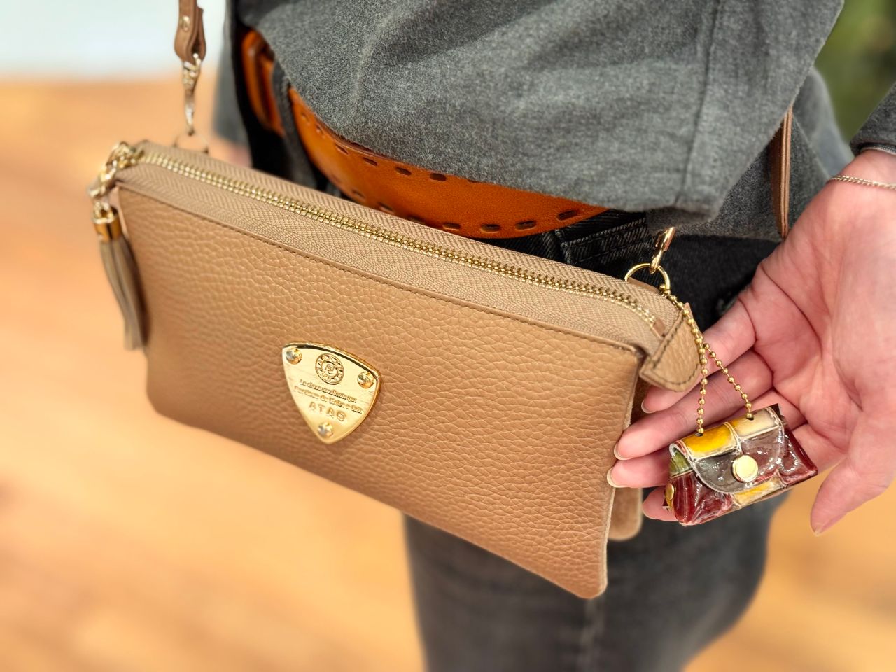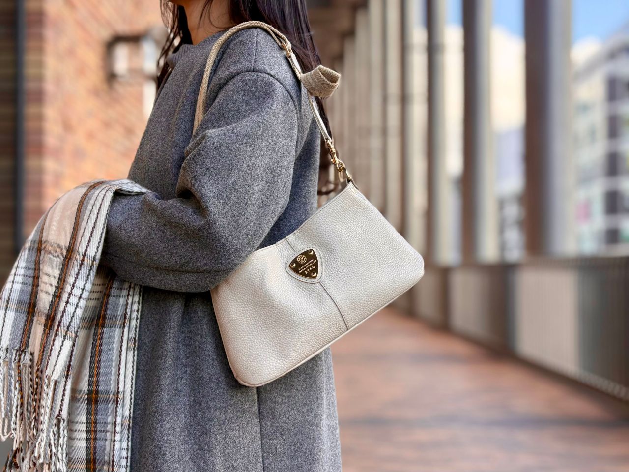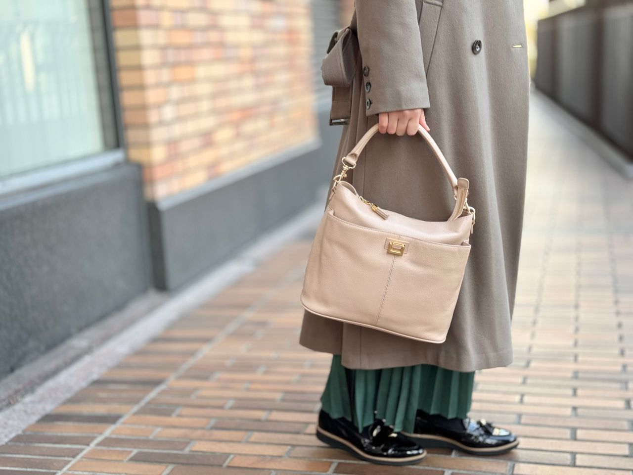 ジャケットに合わせてアミュレットですっきりと持つのも素敵ということで、こちらのアミュレット・ケリー/トープをチョイスしてコーディネートしてく出ました!洋服のトーンともマッチしていてとっても素敵ですね^^♪