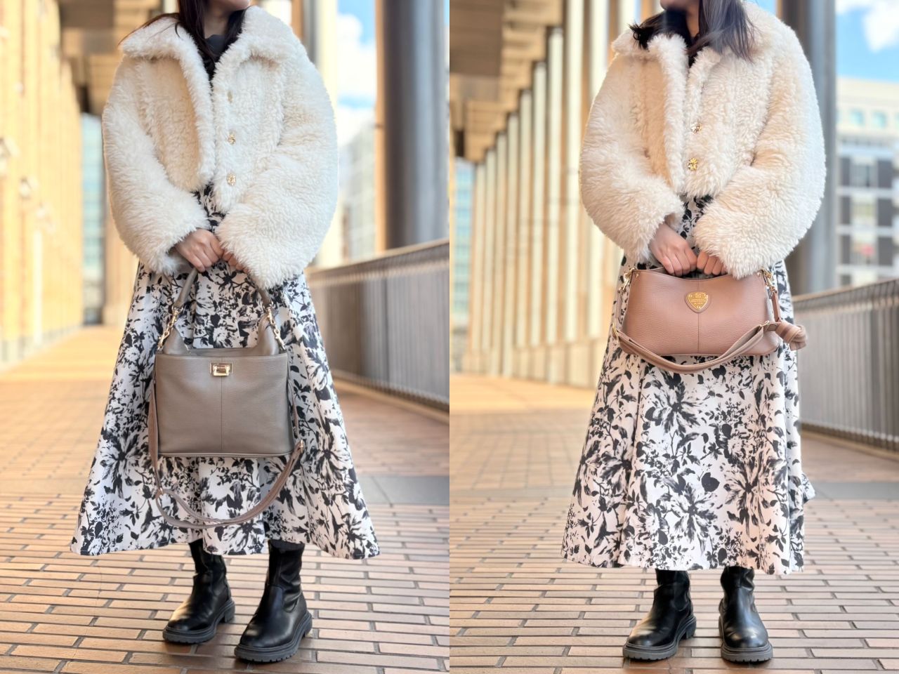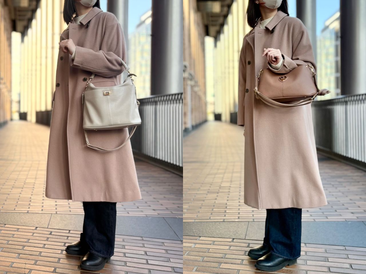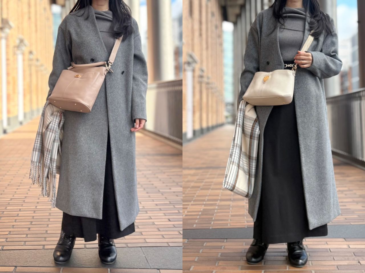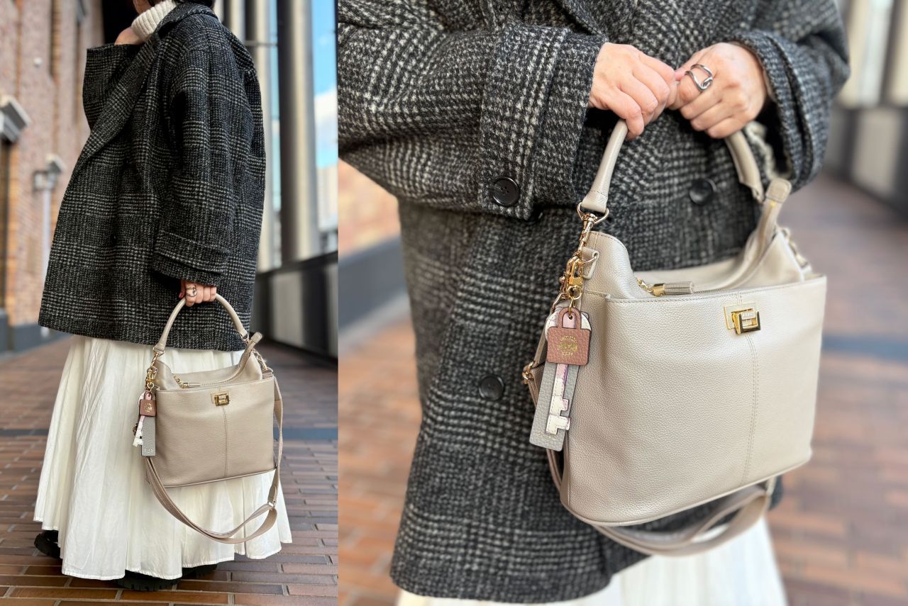 それでは、スタッフの冬コーデに合わせてバッグが変わるとどんなふうに雰囲気が変わるのか、、、皆さまのお好みはどちらか楽しみながらご覧くださいませ^^♪