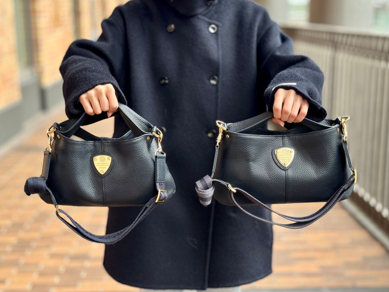 ハンドルで持つことが多いというスタッフK2。ロング丈の色の濃いネイビーのコートに合わせて...上品で華やかとっても素敵です^^