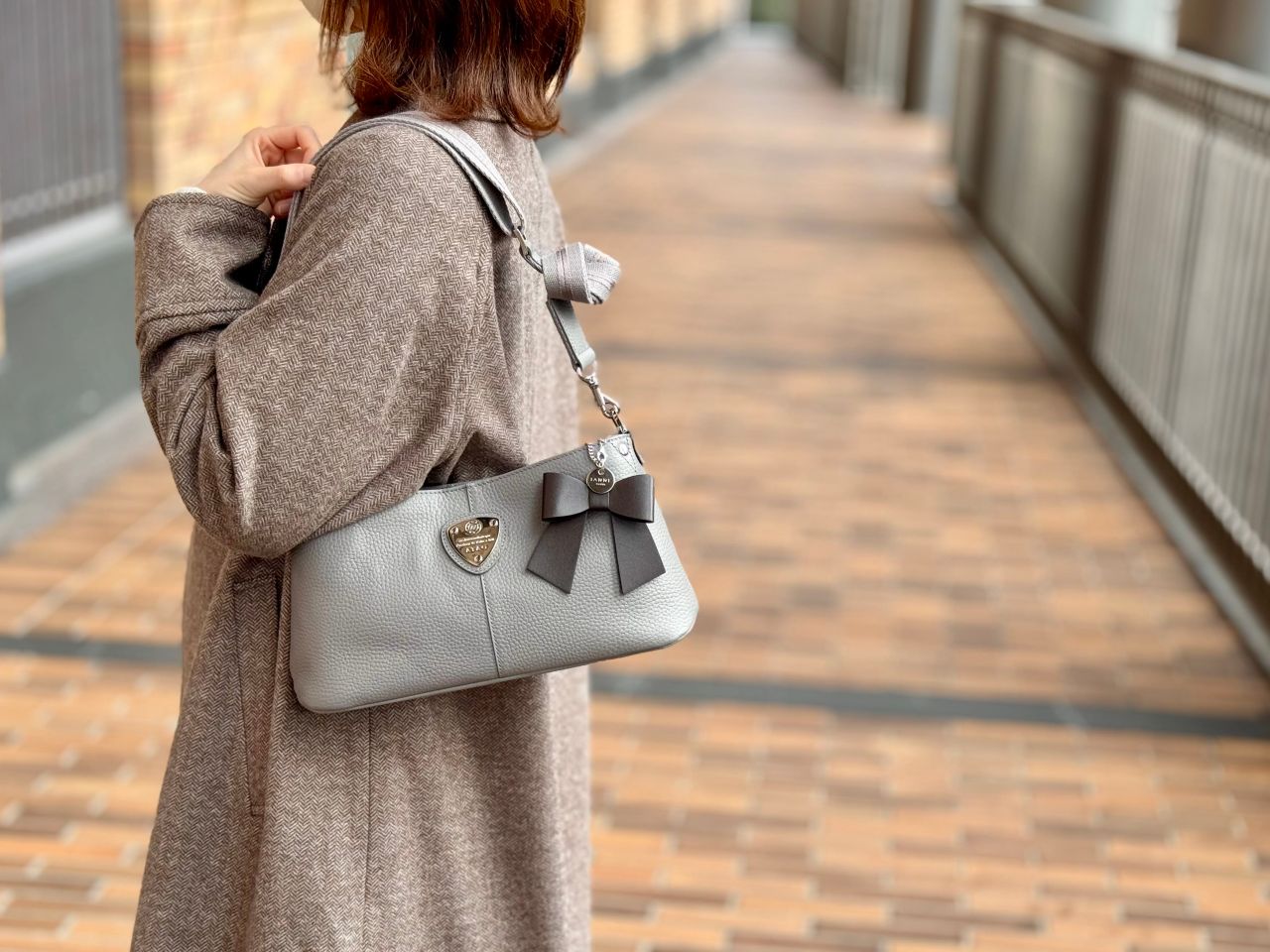 チャームを付けてバッグをアレンジ!グループブランドIANNE(イアンヌ)のチャームをチョイス!【アイスグレー×ネイビー】クール印象ですがリボンチャームがとっても可愛くてキュンとしてしまいます^^