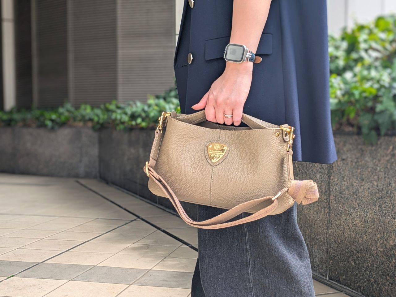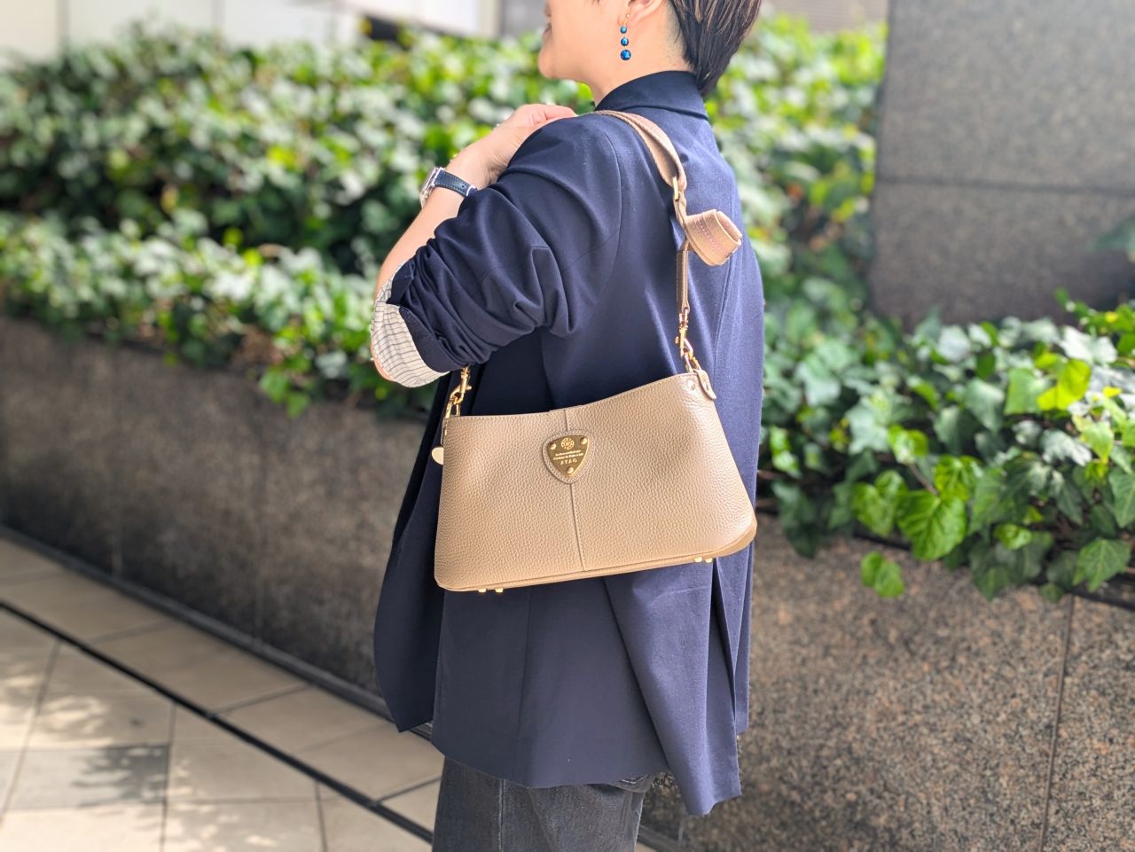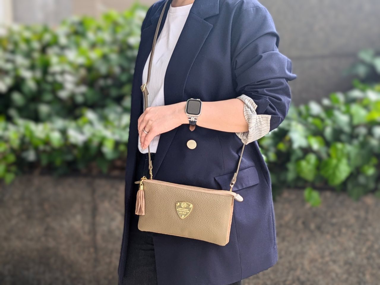 レザーの持ち手部分がすっぽりとマグネット下に収まるギミックも“アタオらしい”使いやすさへの気遣い。付属のベルトを使って肩掛け、ななめ掛けにしたときに持ち手が邪魔にならず、すっきり見えるデザインになっています。