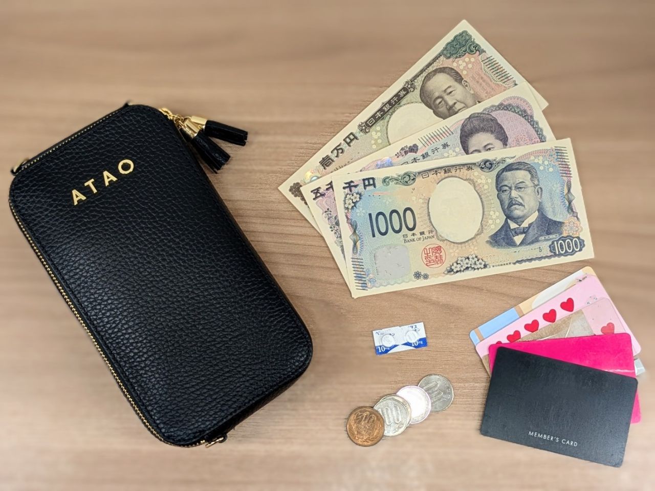 (紙幣6枚、硬貨10枚、硬質カード14枚、薄めのカード13枚 =カード計27枚)