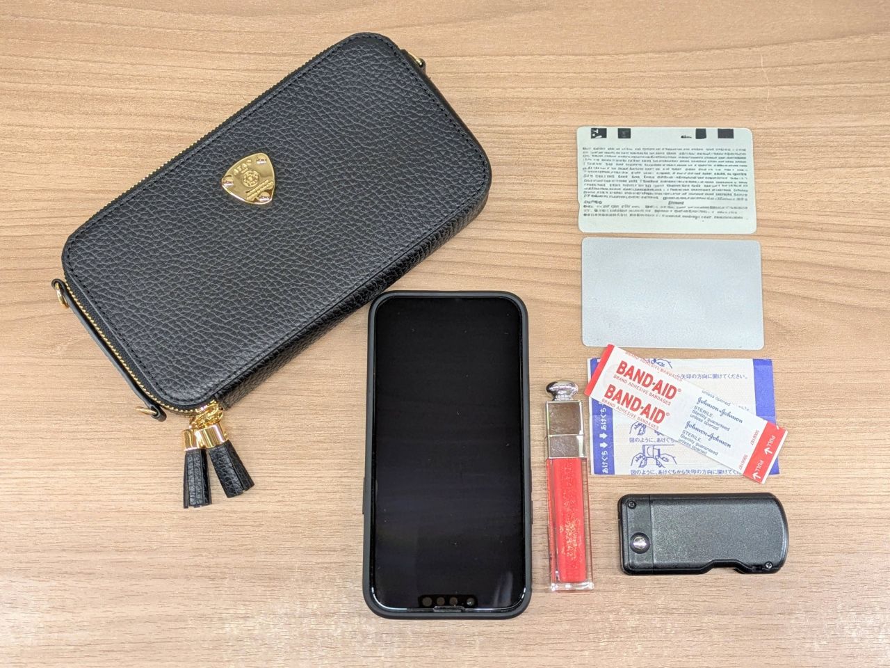 (500mlペットボトル、スマート長財布“スリモ”、スマートフォン、エコバッグ、ワイヤレスイヤホン、リップ、ポーチ、ハンカチ、キーケース)