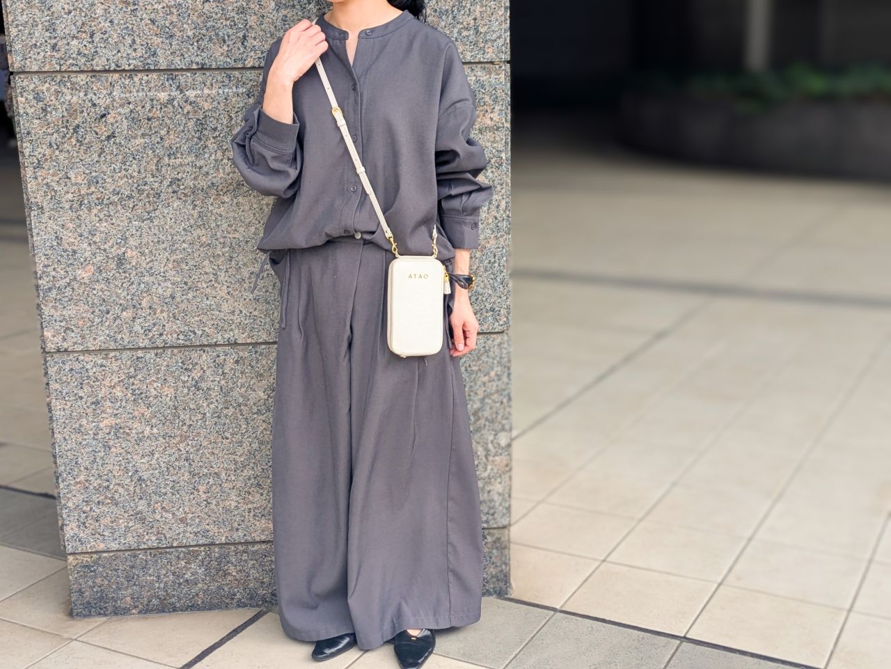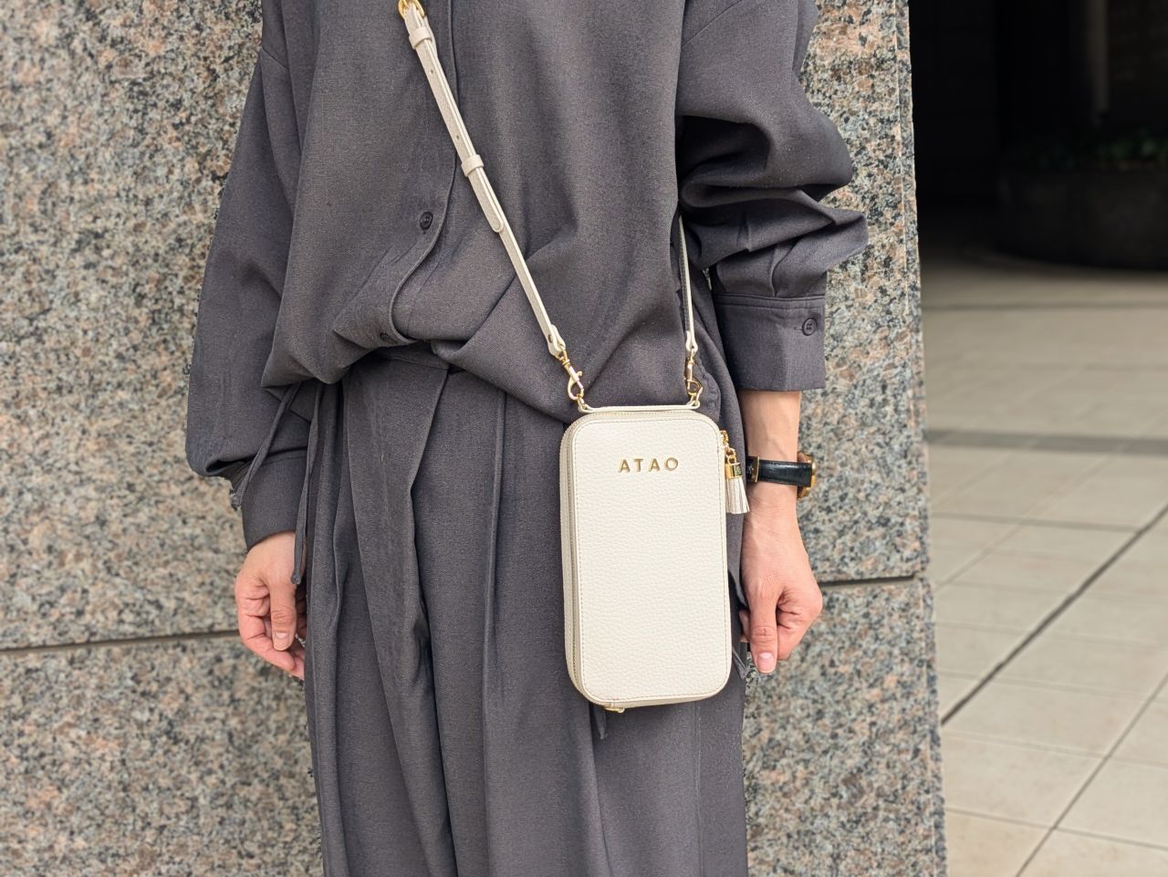 アミュレットはダブルファスナーで、ザ・お財布ポシェットというよりも、<スマホショルダーにお財布がくっついている>イメージ、というと伝わるでしょうか……。