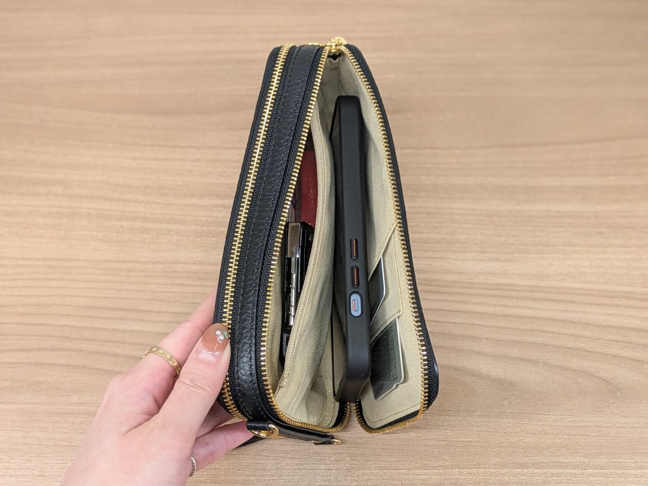 ↑ 三角エンブレム側にはスマートフォンと、加えて少し貴重品を入れることができます。