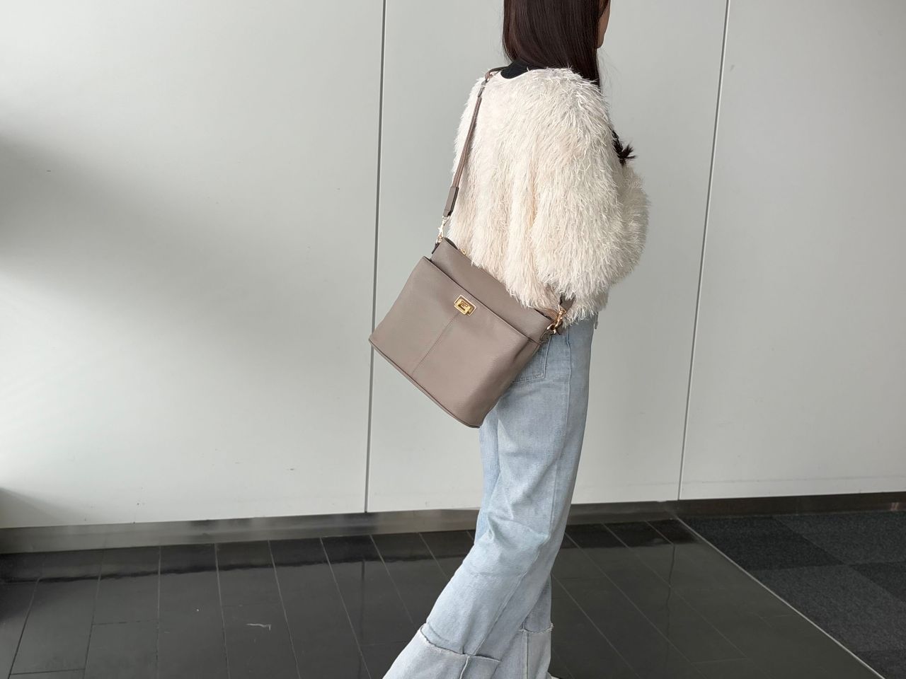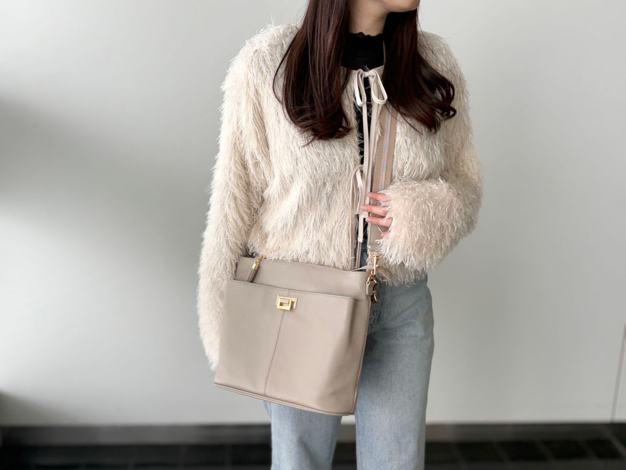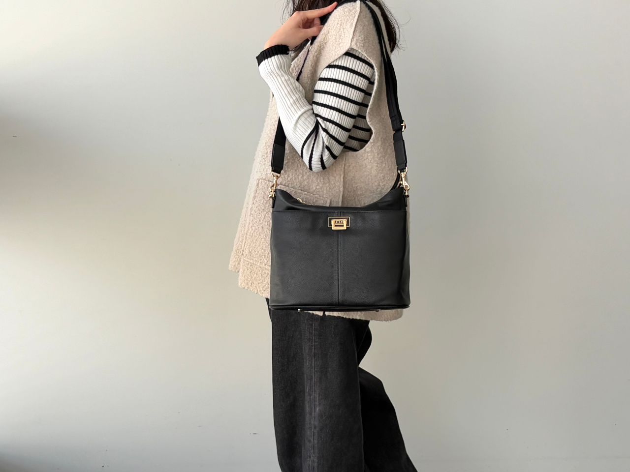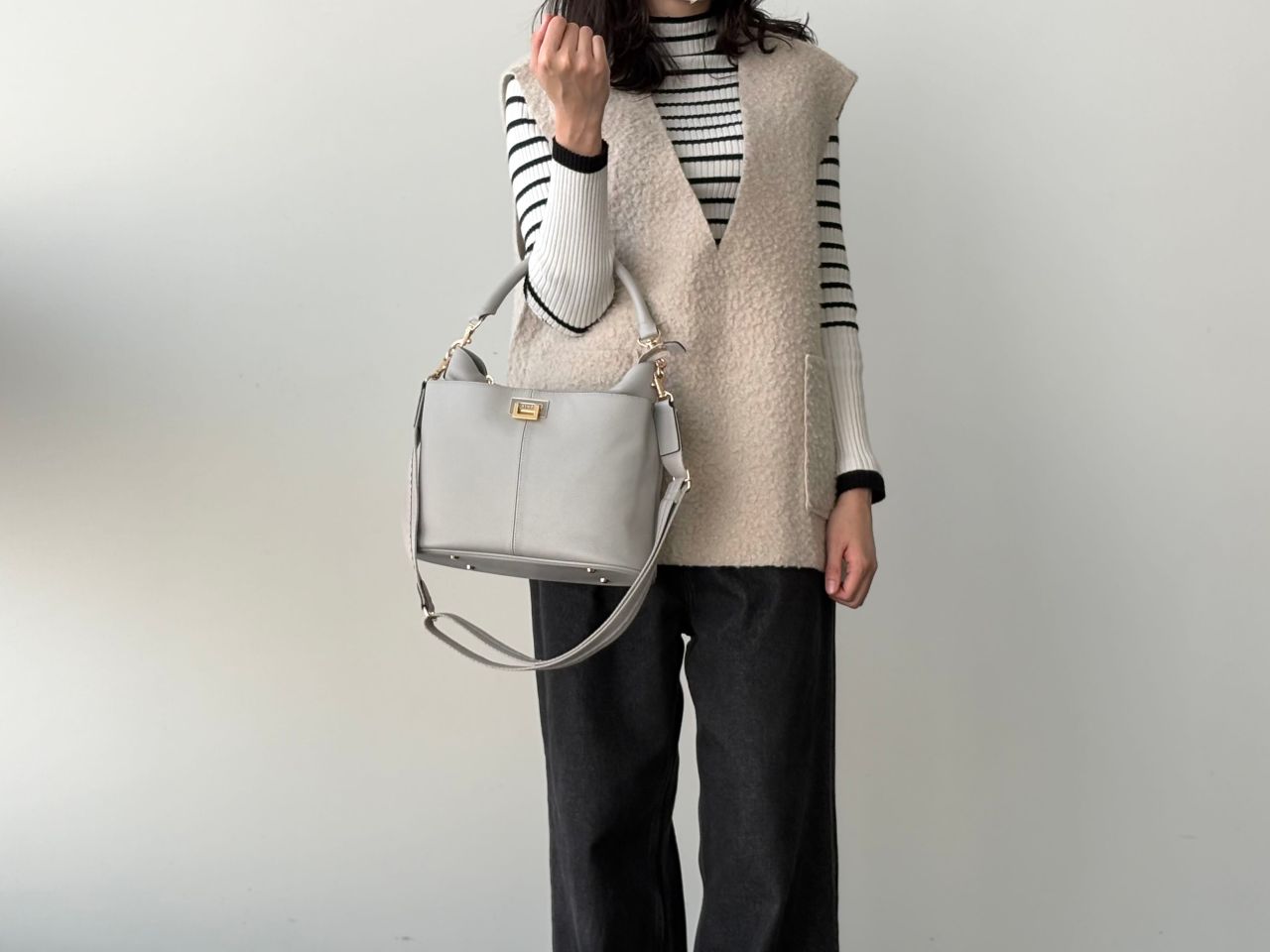 かっちりし過ぎないフォルムと柔らかいレザーの質感。いつものコーデに合わせても浮かず、自然に馴染みながら、ほんの少しだけ全体を整えてくれます。