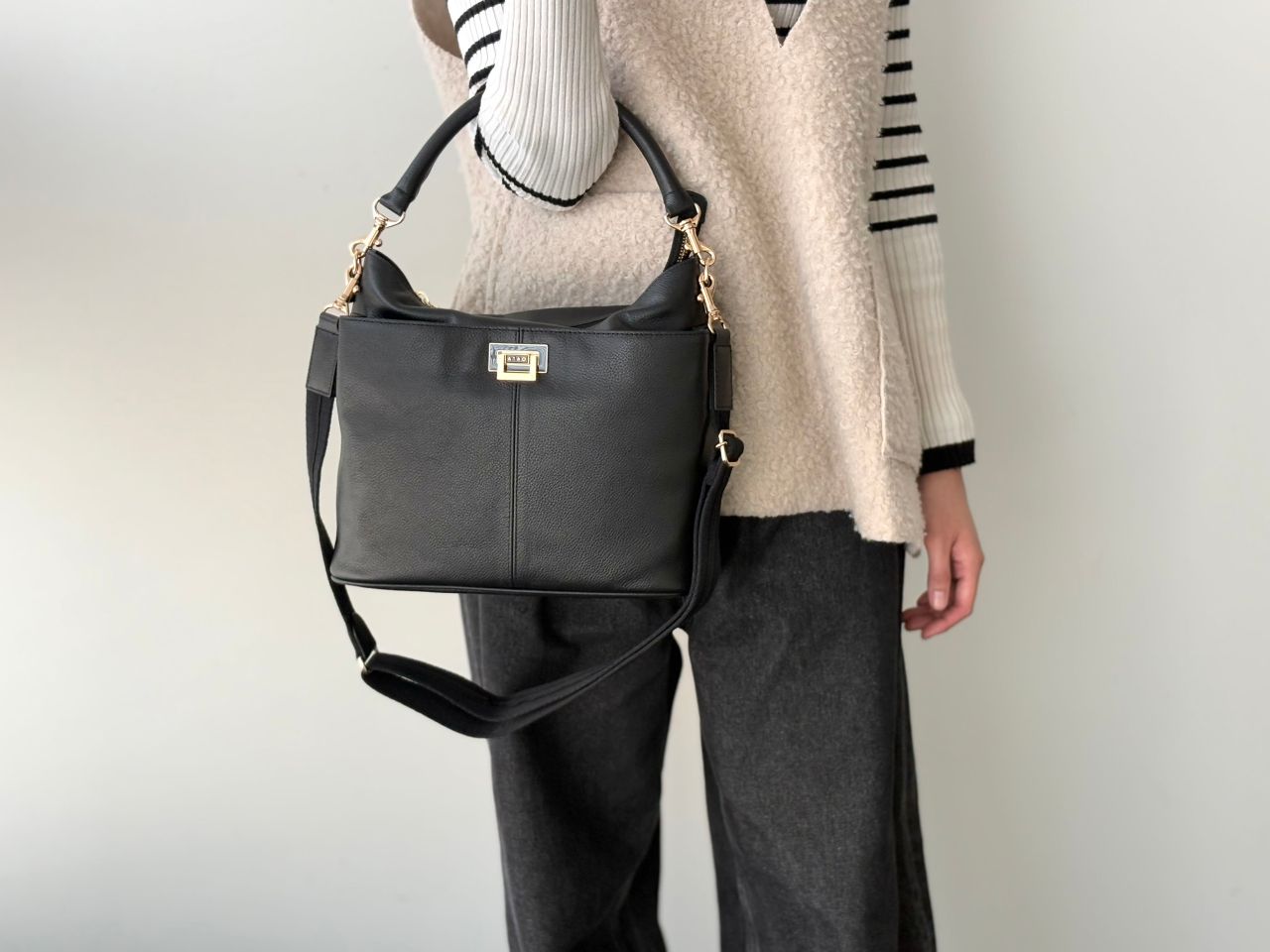 王道ですが、やはり安定感のあるブラック。金具のゴールドが映えますね。