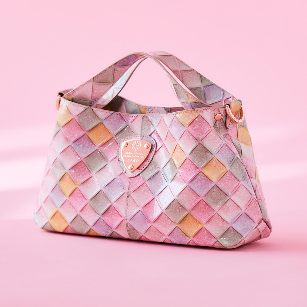ピンク、イエロー、グリーン、ブルーなど、春らしいトーンのグラデーションが美しく、アクセサリー感覚で持てる絶妙なサイズ感。春のトレンドカラーがバランスよく入っているのも◎。一点ずつ柄の出方が異なるため、自分だけのバッグとして愛着もひとしおです。