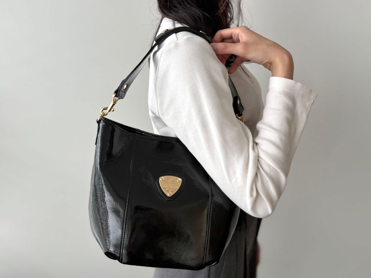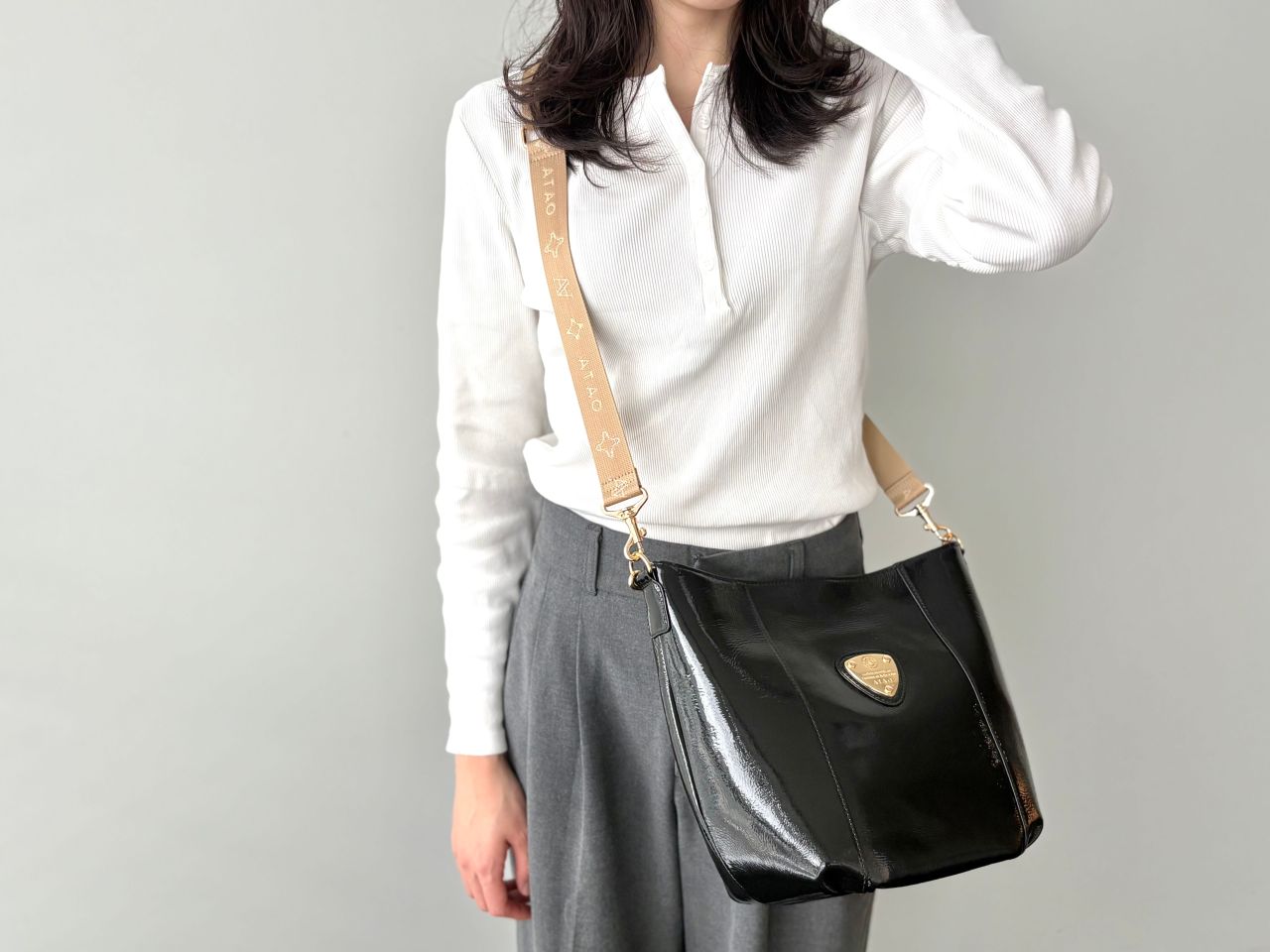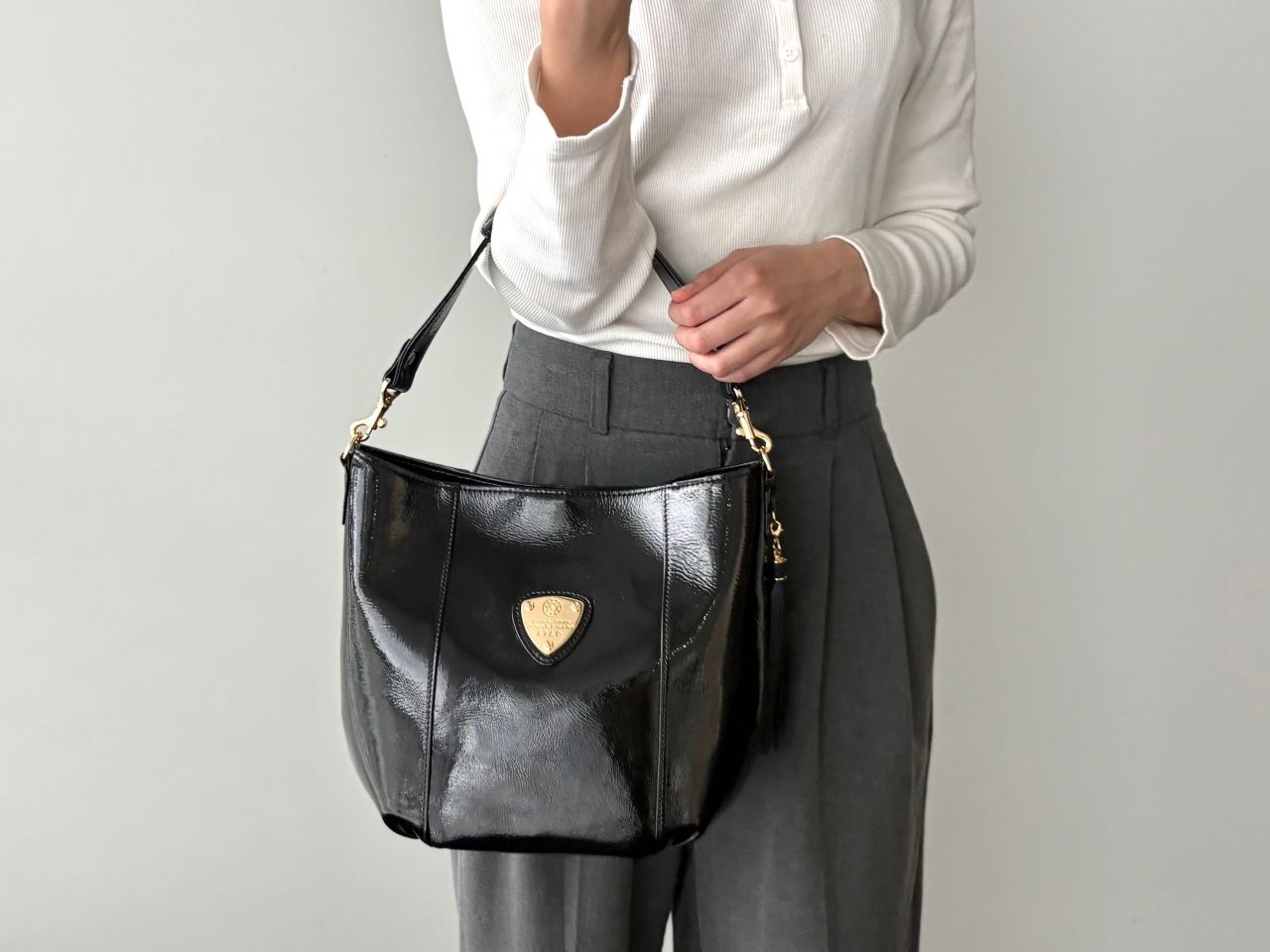 エナメルの艶感がコーディネートにさりげない華やかさをプラスし
