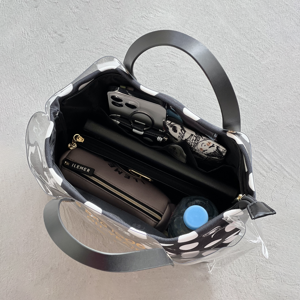 A4サイズまではいらないけど、小さすぎないちょうどいいサイズ。そんなご要望にお応えしたKIRAKIRAは日常使いに最適なサイズ感。インバッグとPVCバッグのコラボレーション。内側のポーチと外側のPVCバッグがセパレート。中身のポーチはインバッグとしても使えるし、外側のバッグはPVCバッグとして別々に使う事が可能。このギミックはコーディネートの幅を無限に拡げてくれます♪ILEMER(イルメール)(いるめーる)で大人気のクリアバッグKIRAKIRA。(セパレートバッグ)(ハンドバッグ)(ミディアムバッグ)インバッグとクリアバッグのコラボレーションは、内側のポーチと外側のクリアバッグがセパレートになっていて中身のポーチはインバッグとしても使えます。